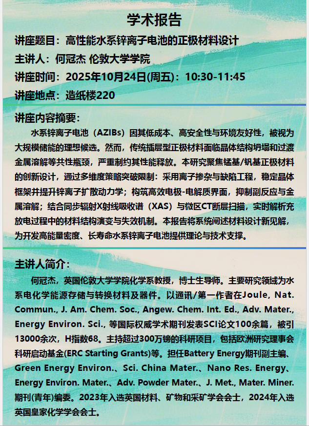 讲座预告:高性能水系锌离子电池的正极材料设计